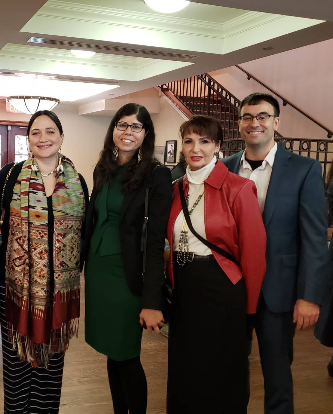Fatima stands with actor Lily Gladstone (left) and James Colombe, a Policy Advisor in the Office of Tribal & Native Affairs (furthest to the right).
