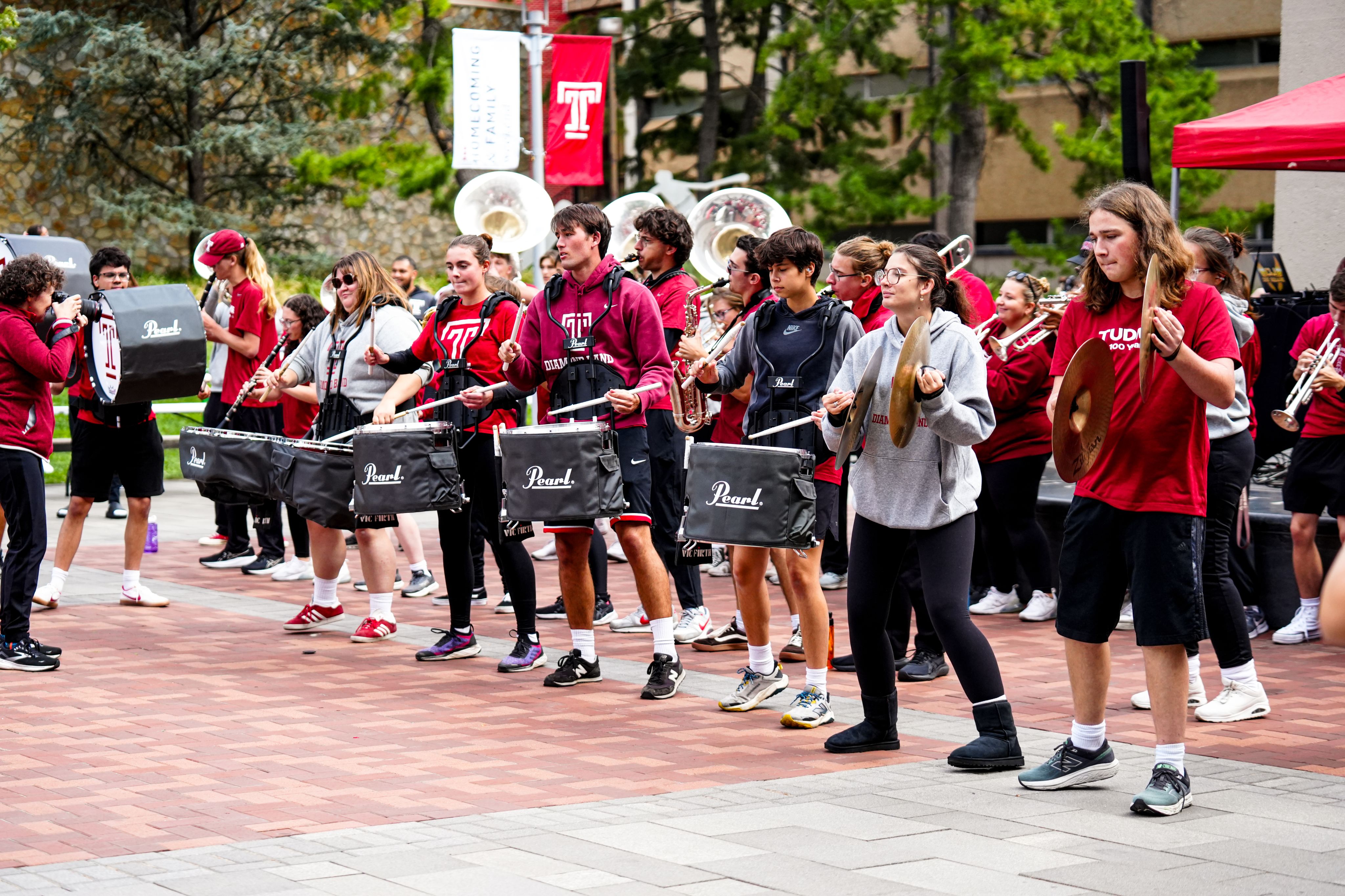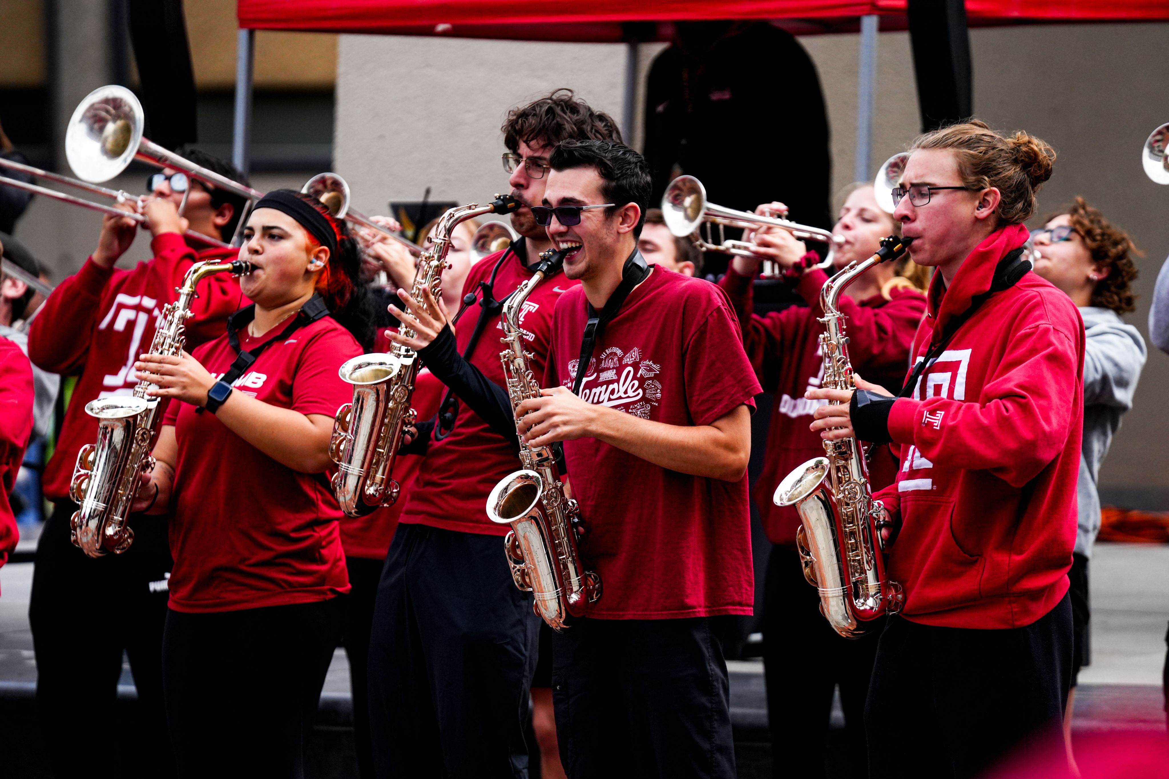 Students gathered at the Bell Tower for a free pep rally to show their spirit, ignited by performances from the Temple University Diamond Marching Band. The event had something for everyone, with free food, music, games and giveaways.