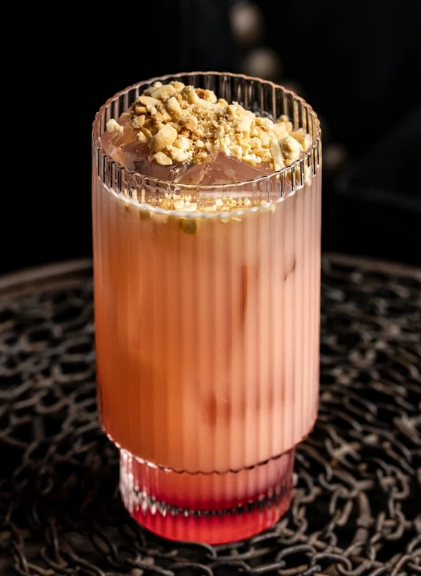 Juyoung gives an example of one of her creations, the Sahara, inspired by neighbors from when she lived in Los Angeles. Her neighbor Gloria and Gloria’s husband’s ran a taco shop. There, they sold a non-alcoholic beverage that fused a drink from his Mexican culture, agua de jamaica (a hibiscus-infused iced tea), with one from his wife’s Salvadoran culture, horchata (a sweet beverage made from rice milk and cinnamon). The result was a drink he called pink milk, a blend of rice milk and cinnamon topped with diced cantaloupe, a drizzle of hibiscus tea, and crushed peanuts.
