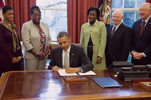 President Barack Obama signs the Antiquities Act to induct new heritages sights in the national park system in March 2013. Attended by Lydia Sermons (center-right), a relative of Harriet Tubman (center-left), Congressional Members, Obama Administration Cabinet Members, Nat’l Park Service and heritage site officials. (White House photo)