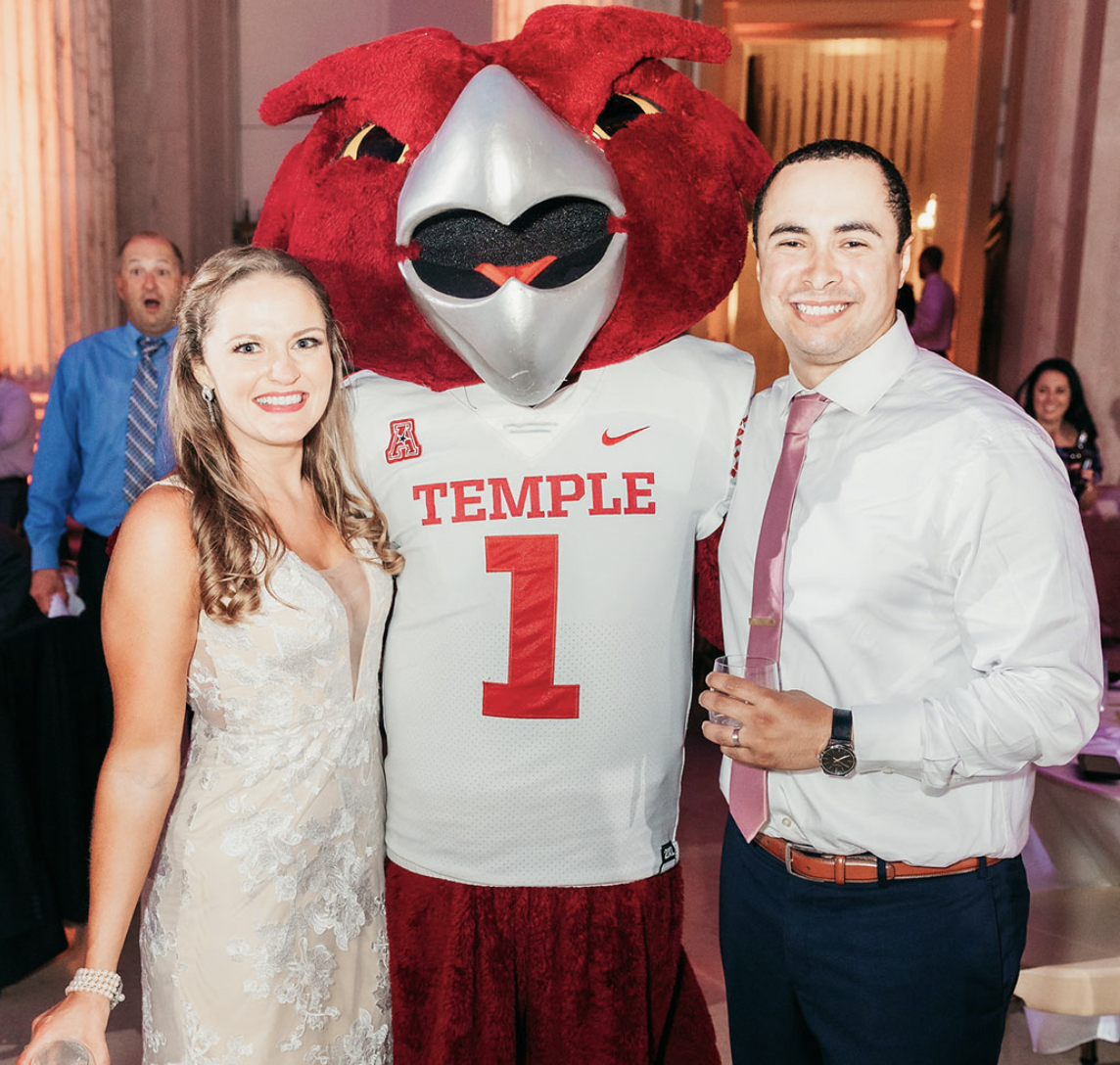 Three years after they met and became friends at Temple, Ray and Jenna started dating in October of 2015. When it came to the proposal in 2018, Ray created the perfect cover story by convincing Jenna they were going to be interviewed for a Philadelphia Inquirer article about young “pet parents” that featured their dog, Dexter. Jenna asked if they could take the photos at Temple because they had never taken Dexter there and she always loved seeing dogs on campus, not knowing Ray had envisioned doing the proposal on campus as well. They got married a few months later in a private ceremony in May of 2019, and finally got the chance to celebrate with their family and friends at their wedding in October of 2021.