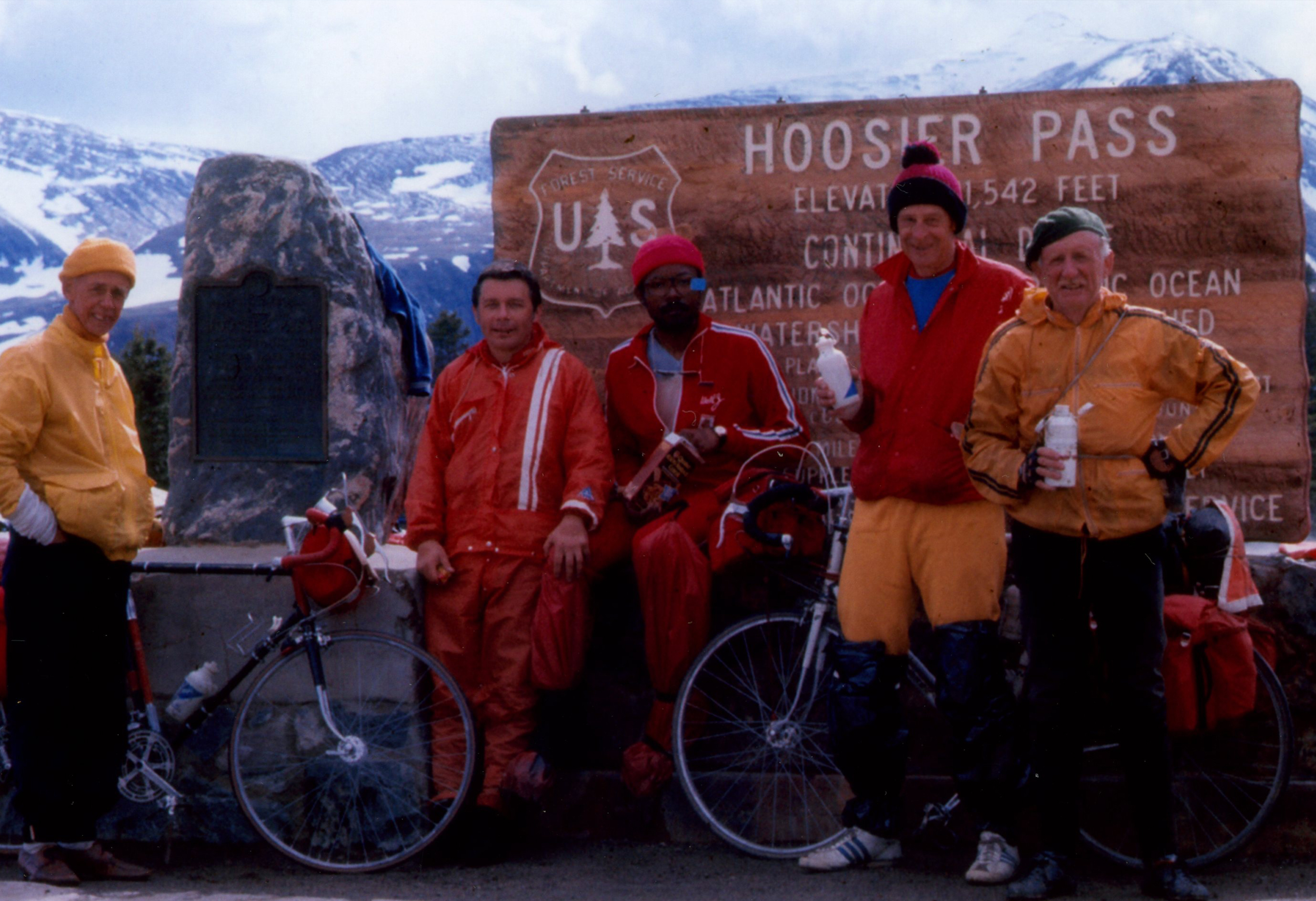 Walter and friends at the top of the Hoosier Pass between Breckinridge and Fairplay, Colorado during the Bikecentennial, 1976. Photo taken by Theresa Whelan Leland.